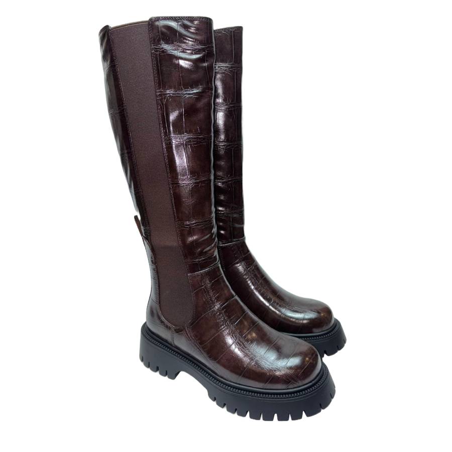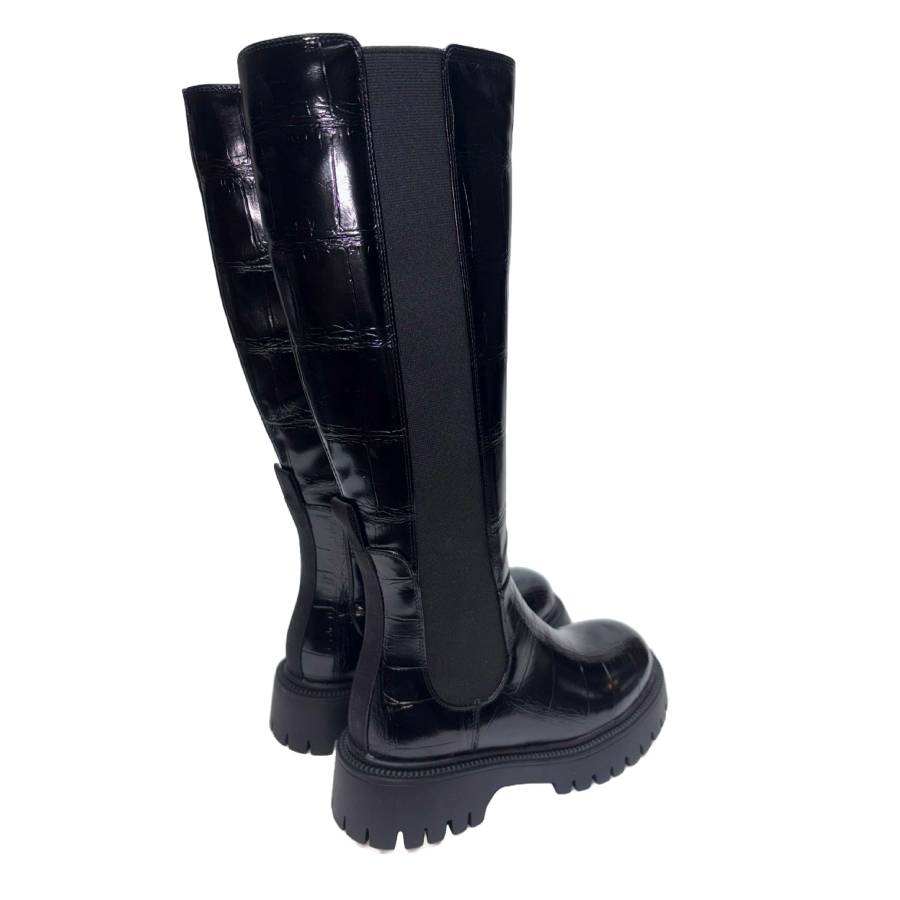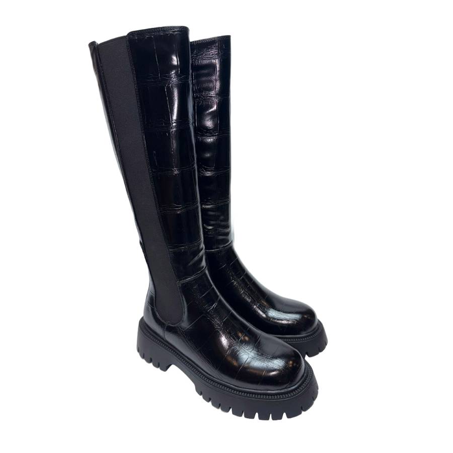 Stivali alti al ginocchio con finitura lucida effetto coccodrillo, suola carrarmato e inserti elastici laterali. Stile elegante e moderno.