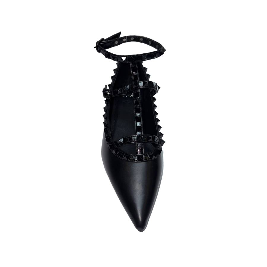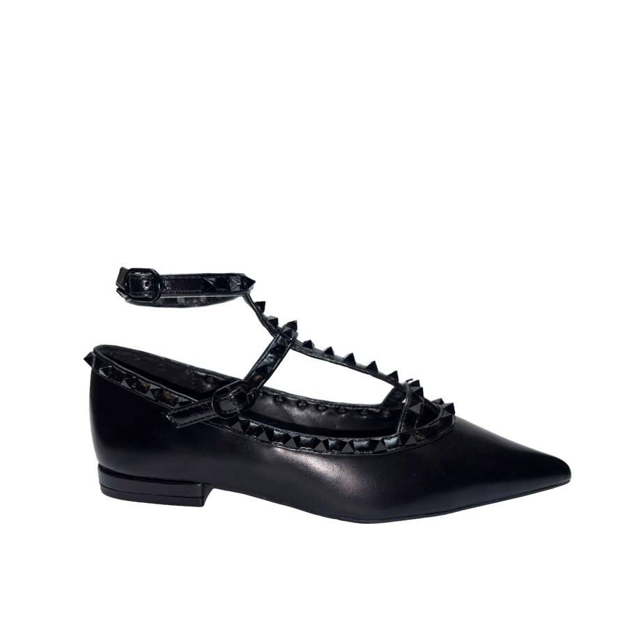 Ballerina a punta, arricchita da cinturini in vernice nera decorati con borchie. Modello con doppio cinturino alla caviglia e sul collo del piede, suola bassa e profilo grintoso. Un mix perfetto di eleganza e carattere rock.
