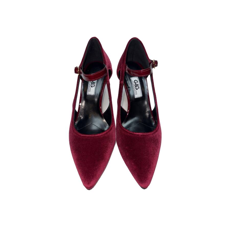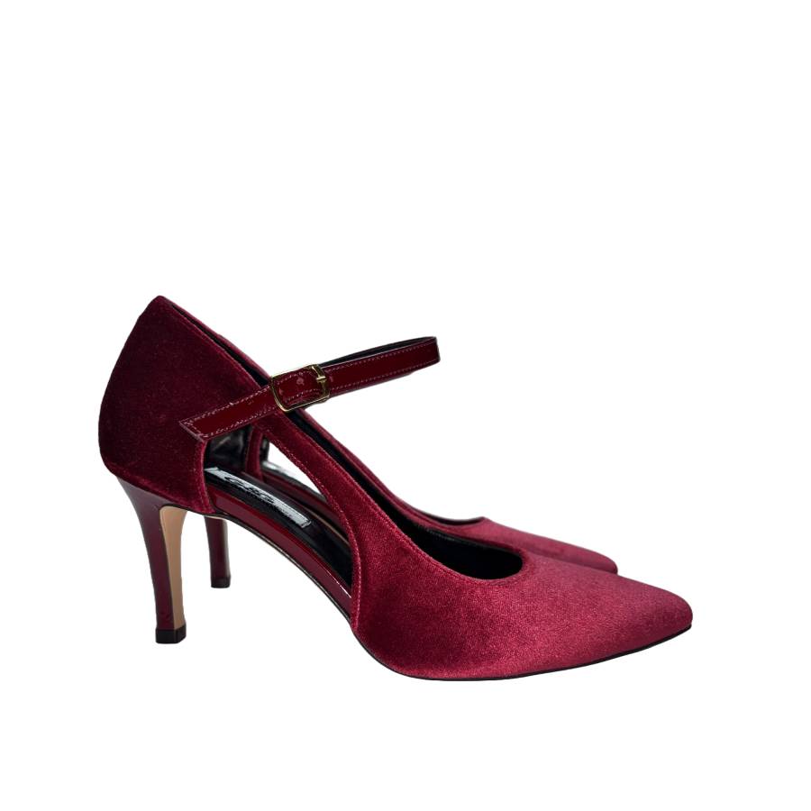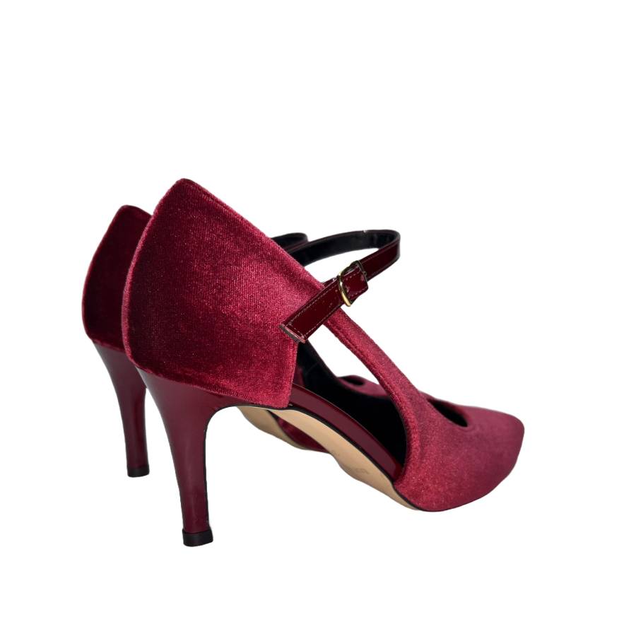 Décolleté in velluto bordeaux con cinturino, tacco 7cm e cuscinetto in memory foam per un comfort extra. Elegante e raffinata, ideale per cerimonie o serate speciali.