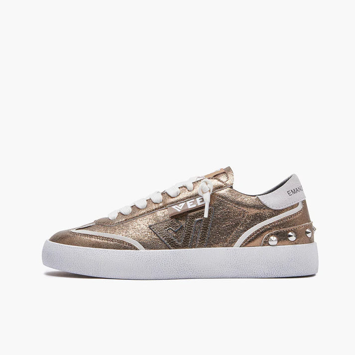Sneaker a cassetta in materiale crackle laminato, dettaglio strass nell'allacciatura, suola in gomma.