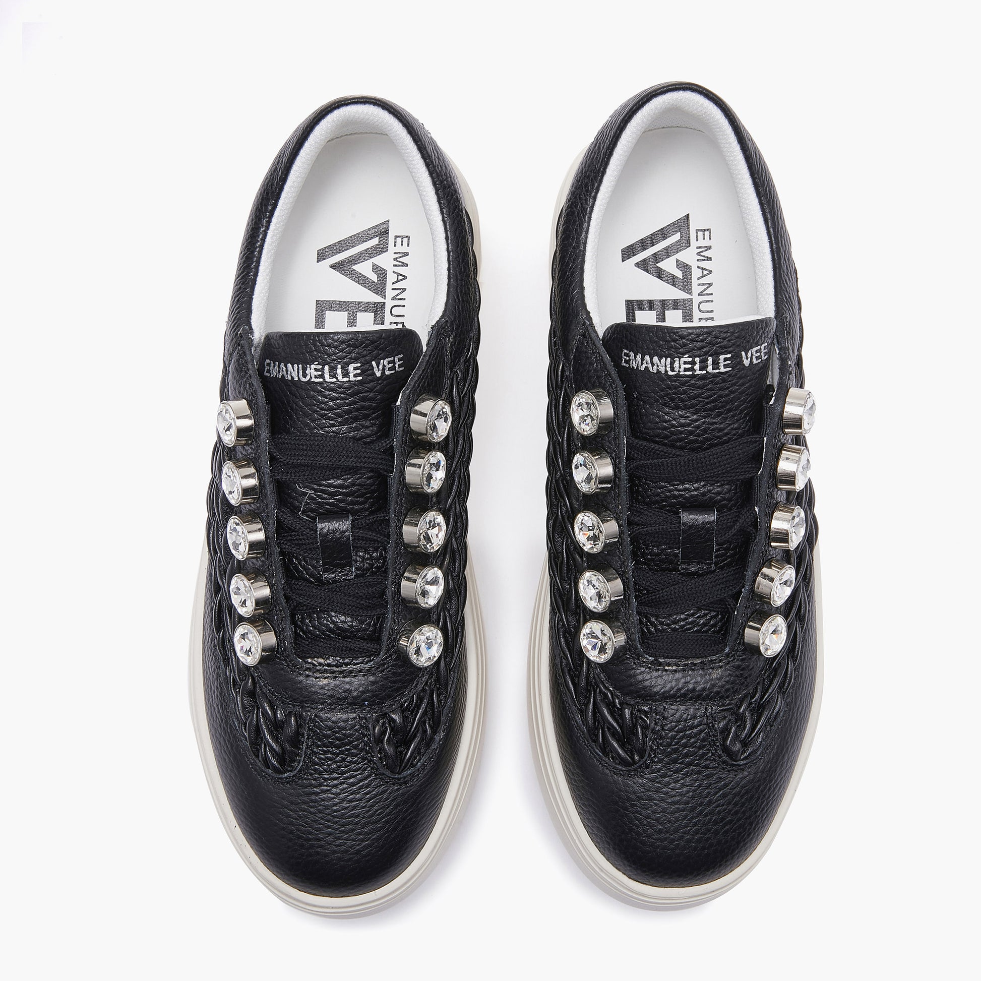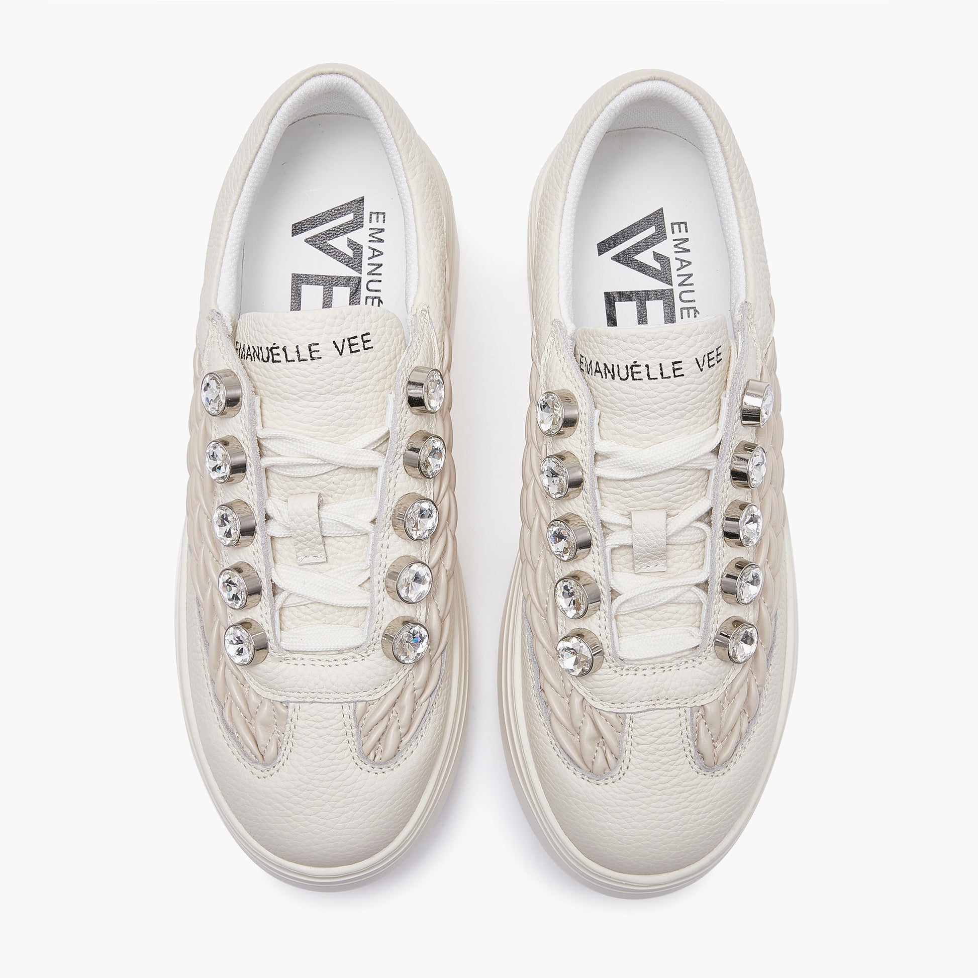 Sneakers in pelle trapuntata con logo e strass, suola alta 50 mm: stile femminile e comfort quotidiano.