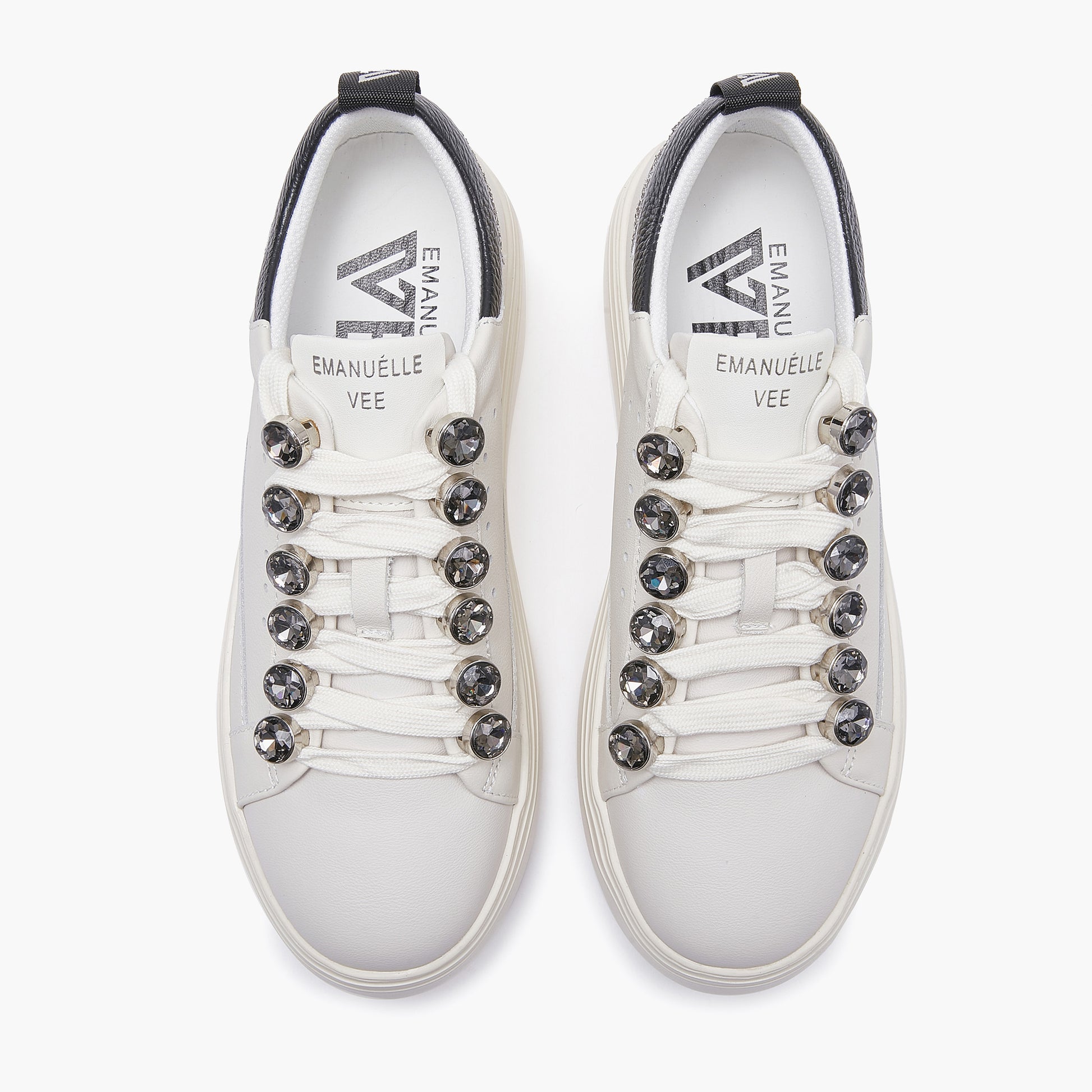 Sneakers in pelle con glitter, strass sui lacci e suola leggera: grintosa, comoda e alla moda.