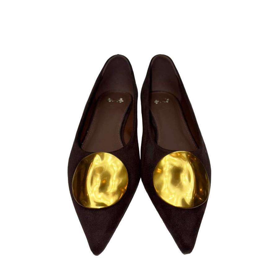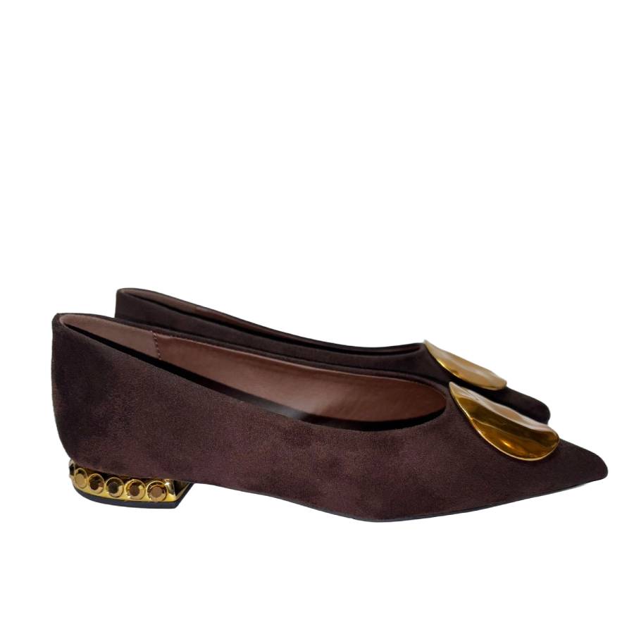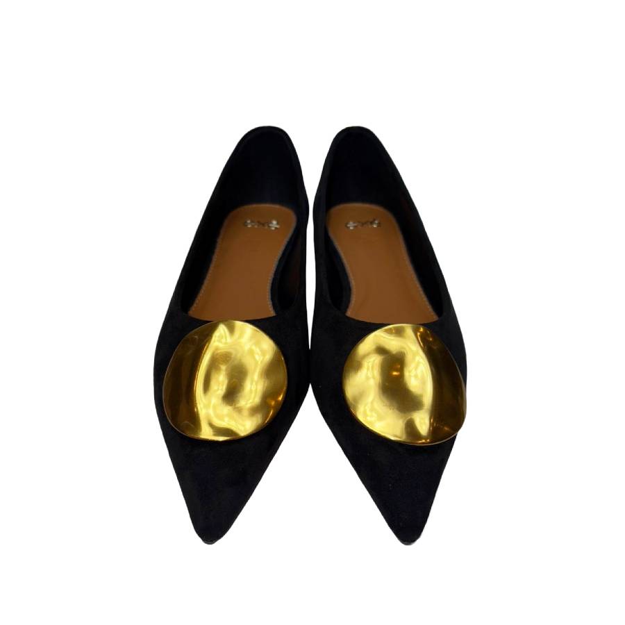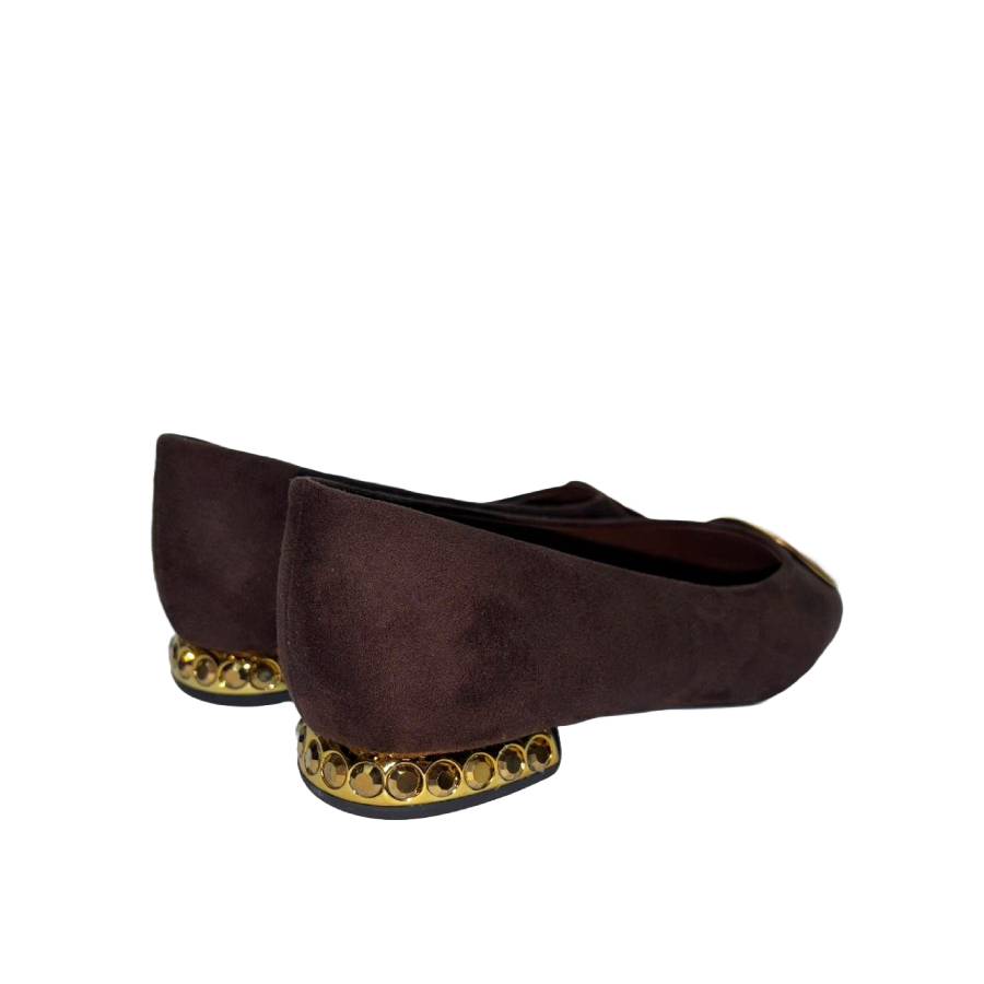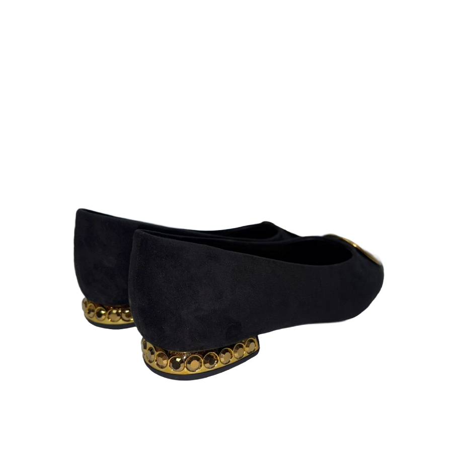 Ballerina a punta in suede con dettaglio dorato sulla tomaia. Il design è elegante e moderno, arricchito da un tacco basso decorato con strass dorati.