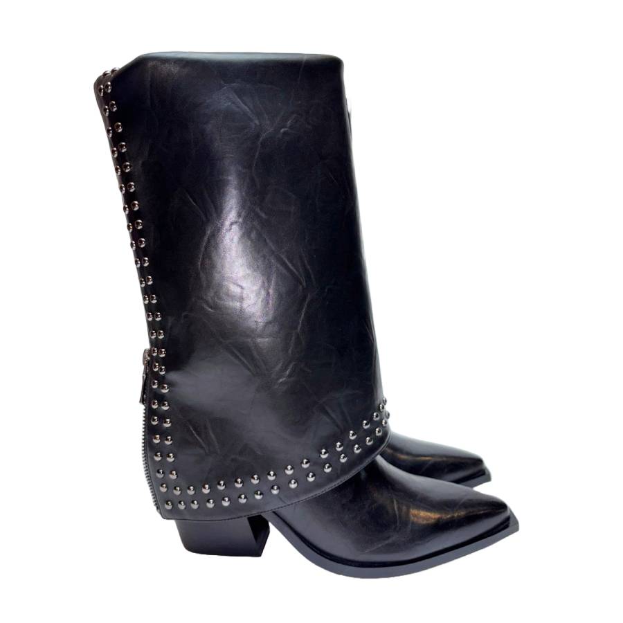 Gli stivali Exè dal design texano uniscono carattere e femminilità in un mix audace e contemporaneo. Realizzati in materiale effetto pelle nera. Le borchie metalliche lungo il gambale aggiungono un tocco rock e grintoso, perfetto per completare look decisi e urban-chic.