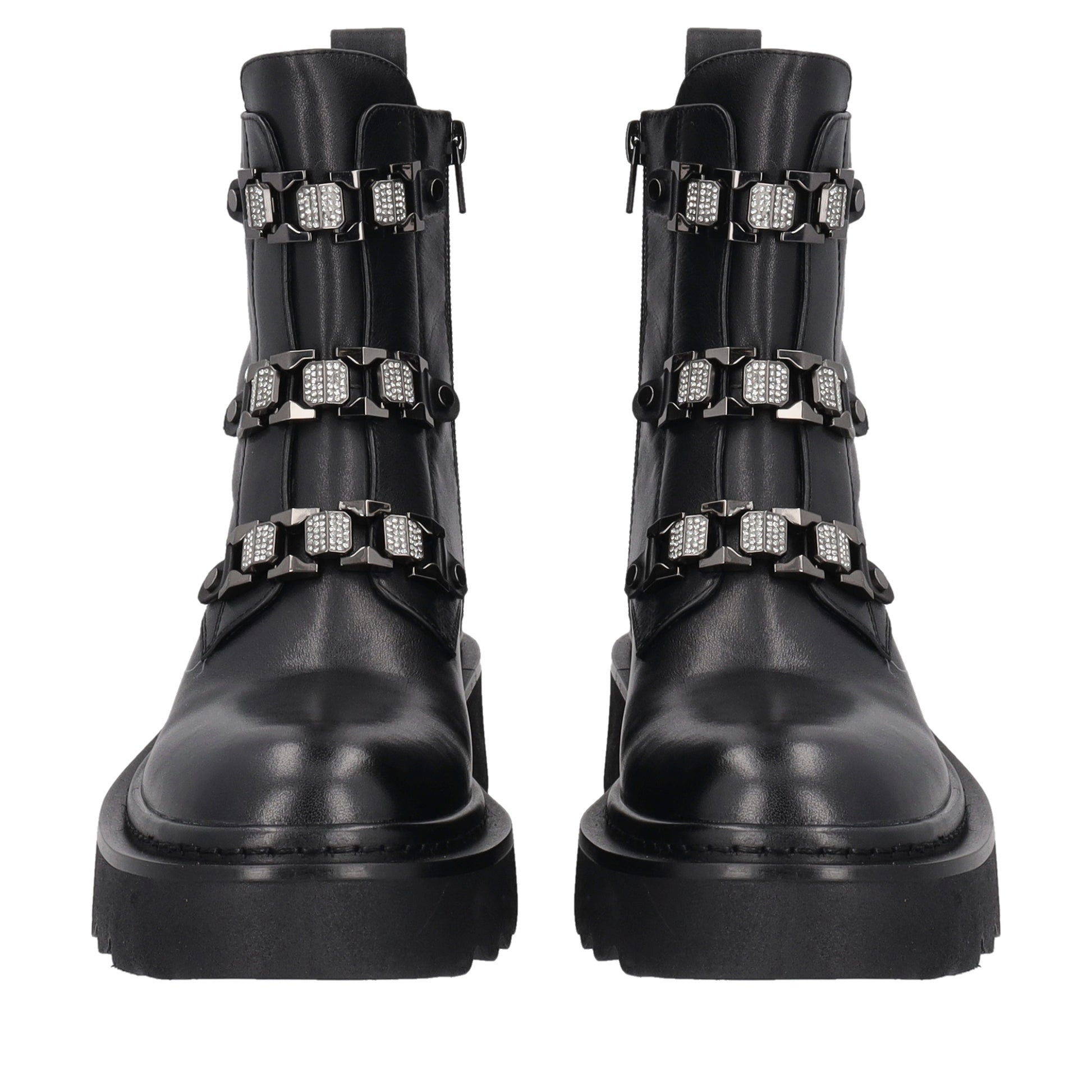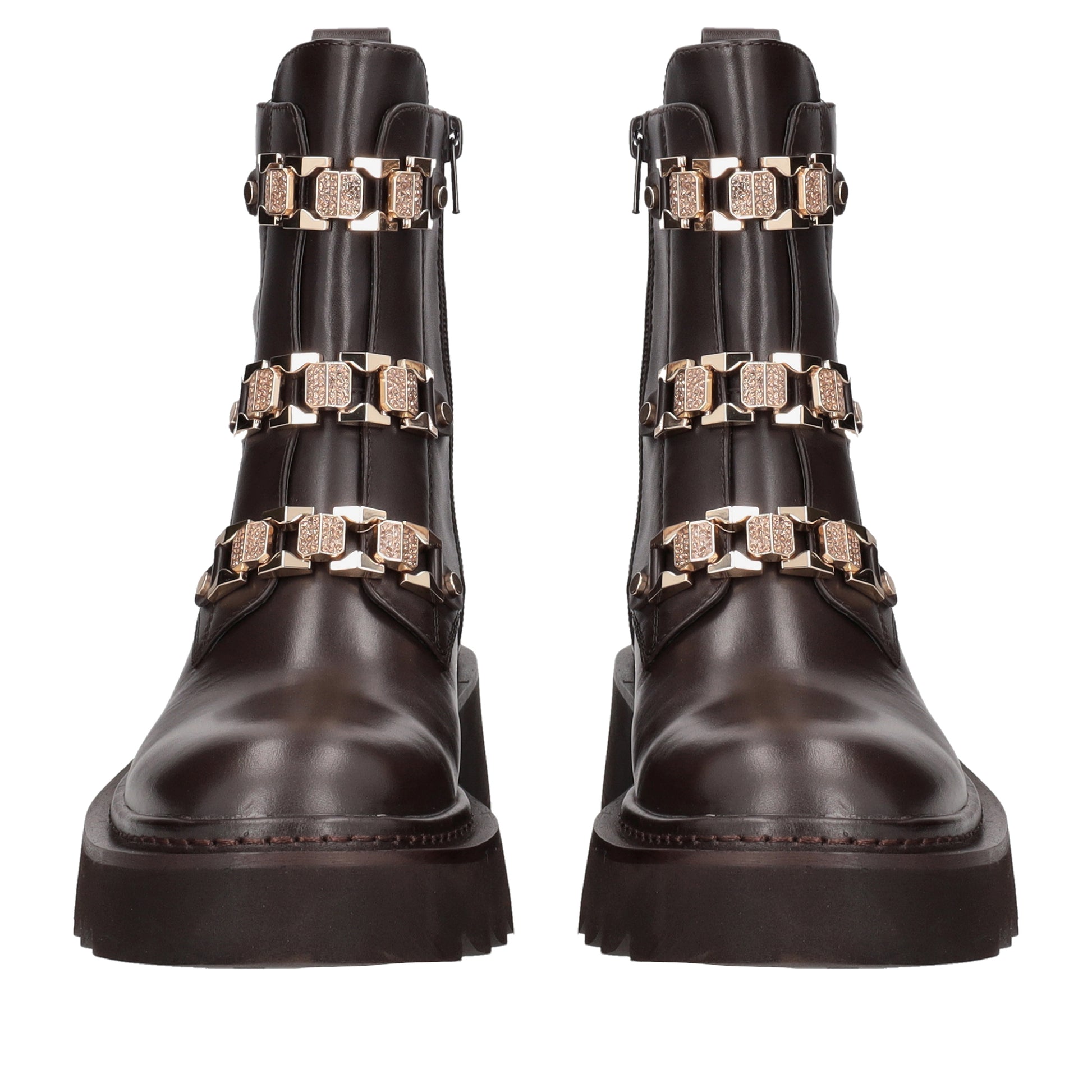Anfibio in pelle senza lacci con catena gioiello frontale e suola carrarmato, stile grintoso ed elegante.