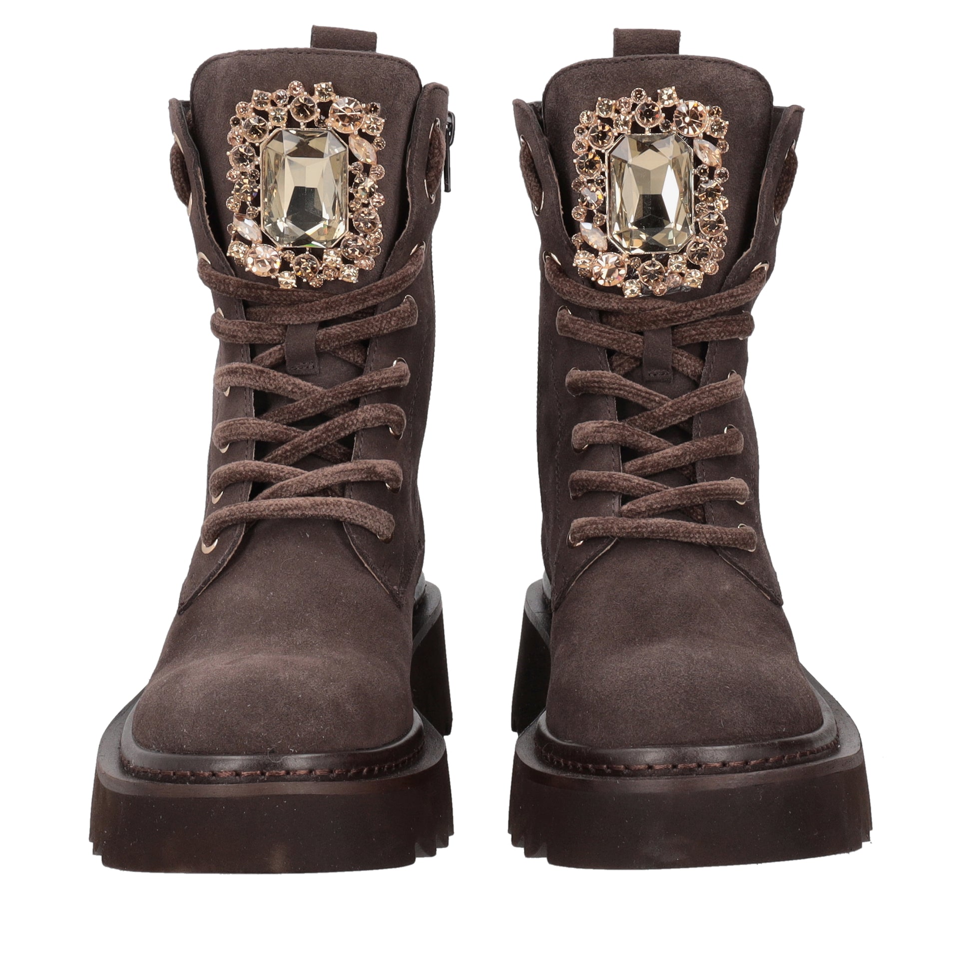 Anfibio in camoscio testa di moro con dettaglio gioiello oro e suola carrarmato, perfetto per un look urban-chic.